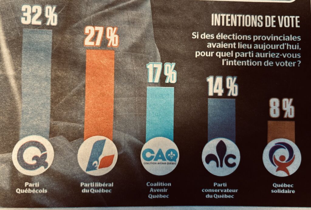 Since then, the Liberals have quietly advanced, mirroring the steady collapse of the governing CAQ. Polls in mid-November 2025 showed the Liberals at 27 per cent support, while the PQ declined somewhat from its recent peaks: